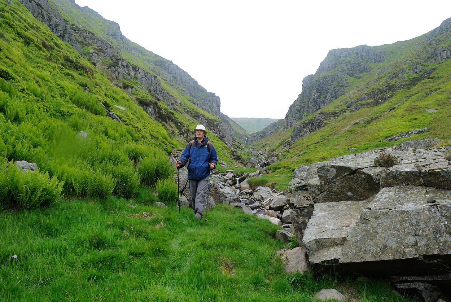 It’s haunted by the fairies; if you’re unlucky enough to get an earful of their magic music, you wander around in the Hen Hole for ever, until the wind blows over your white bones. It was also, of course, a handy secret spot for hiding any stolen cows. The stream runs out between walls of ragged granite, peregrine falcons up there, and a peaty waterfall at your feet.