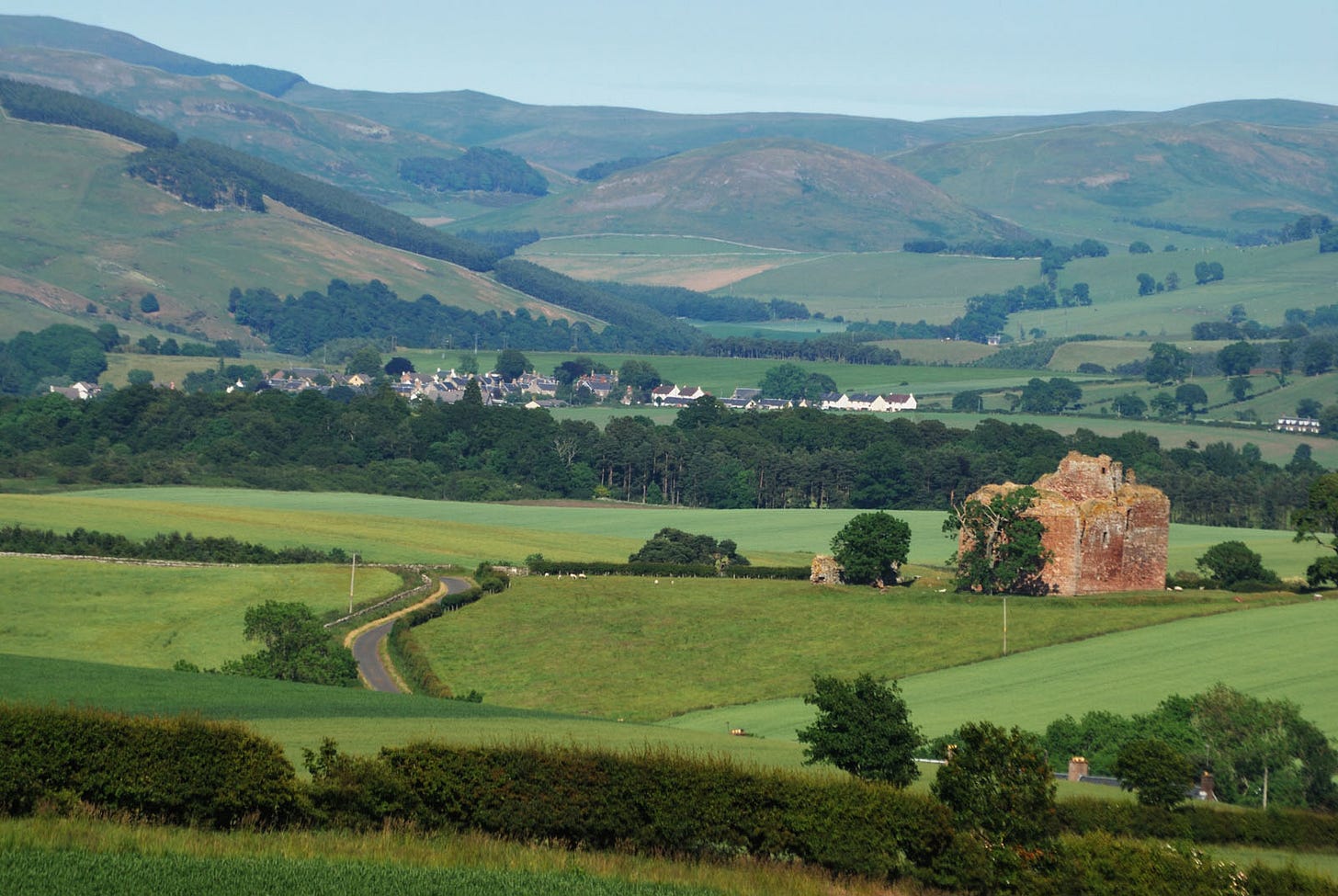 The crossing at Carter Bar: that’s where one of the border battles took place, the Redeswire Fray. On a day of supposed Border truce, a quarrel over a card game erupted into a full International Incident. (My ancestor, Fatlips Turnbull of Bedrule, gets a mention in the ballad as the sensible chap who’d gone to the card game already wearing his leather armour.) On Windy Gyle there’s a pile of stones where Lord Russell got killed on a different truce day. At the hill foot near Morebattle (yes, the clue is in the name) stands the forbidding Cessford Castle: stronghold of the Kerrs, the most feared of the riding families on the Scottish side.